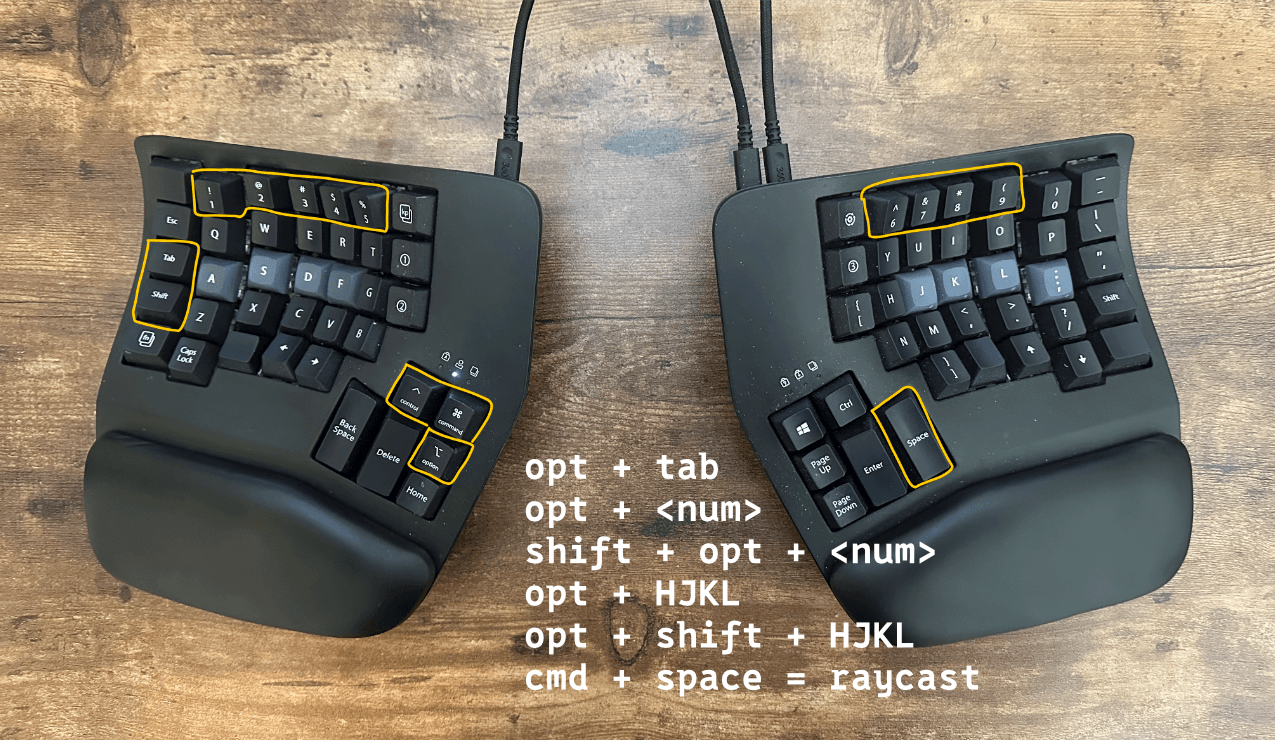 alt + tab: Thumb + reach = toggle between last two spacesalt + 1-9: Thumb + number = instant workspace switchingalt + shift + 1-9: Both thumbs + number = move window to workspacealt + h/j/k/l: Thumb + home row = navigate panes (vim-style)alt + shift + h/j/k/l: Both thumbs + home row = move panes around
